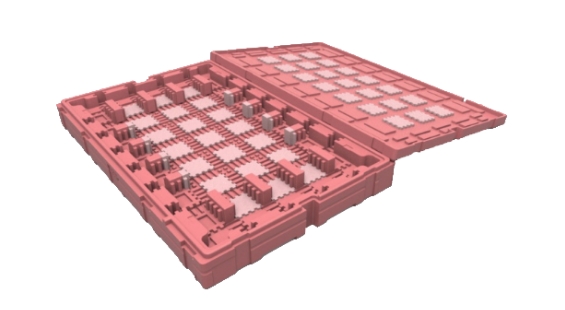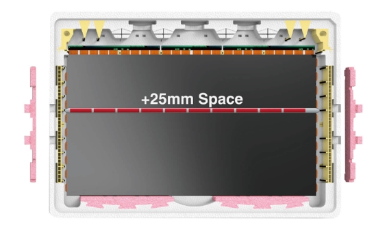 TFT-LCD 面板尺寸多样化是不可避免的趋势,也因此导致停产机种产生大量闲置玻璃运输箱,“移动式档块设计”于箱底及箱盖预留固定卡槽,让档块可垂直和水平移动以调整装片尺寸,即使产品停产后也能藉改变文件块位置再给其他新机种使用,可达成运输箱重复使用并减少新模具开发费用; 且档块是由两种发泡倍率堆栈,低倍率用以固定文件块位置, 高倍率则提供缓冲用以提升保护性;档块可藉由箱底及箱盖卡槽固定于任意位置,不需多余料件支撑于墙面可节省材料成本,甚至可依需求装载不同尺寸面板以增加共享性, 减少新包材的开发。