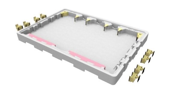 于箱底及箱盖预留固定卡槽,让档块可垂直和水平移动以调整装片尺寸,即使产品停产后也能藉改变文件块位置再给其他新机种使用。