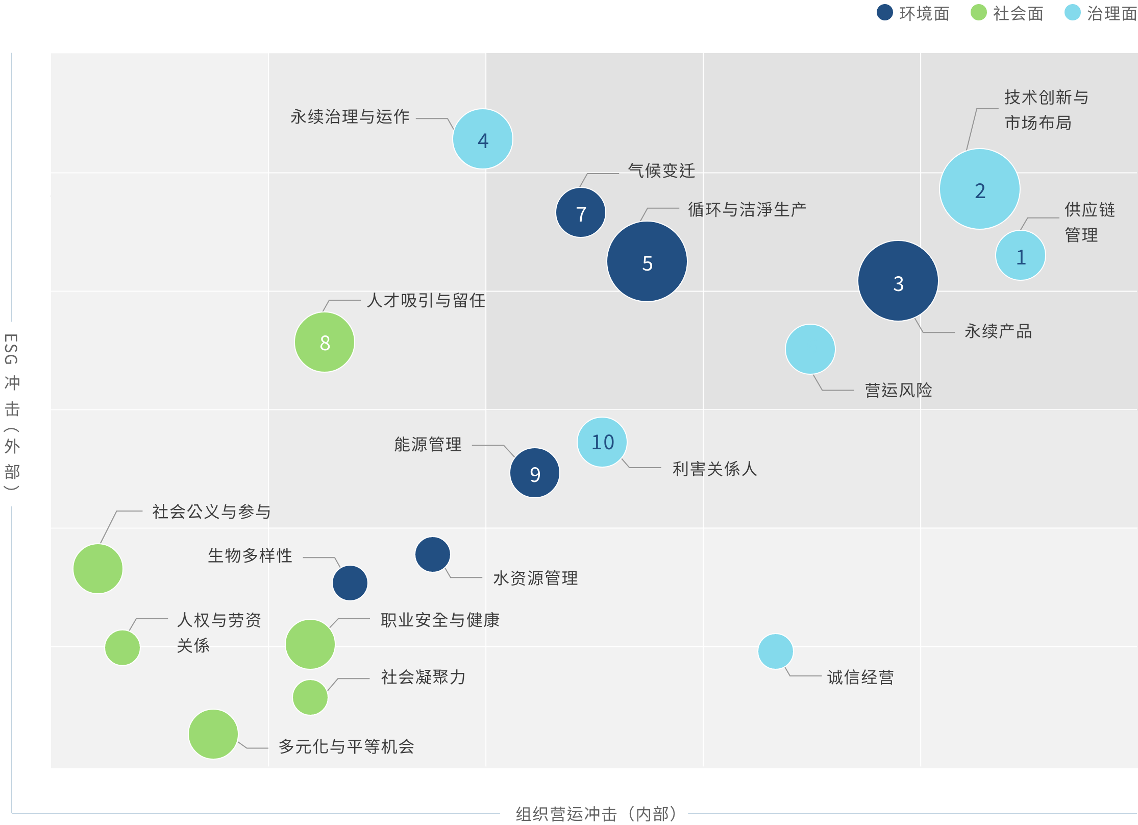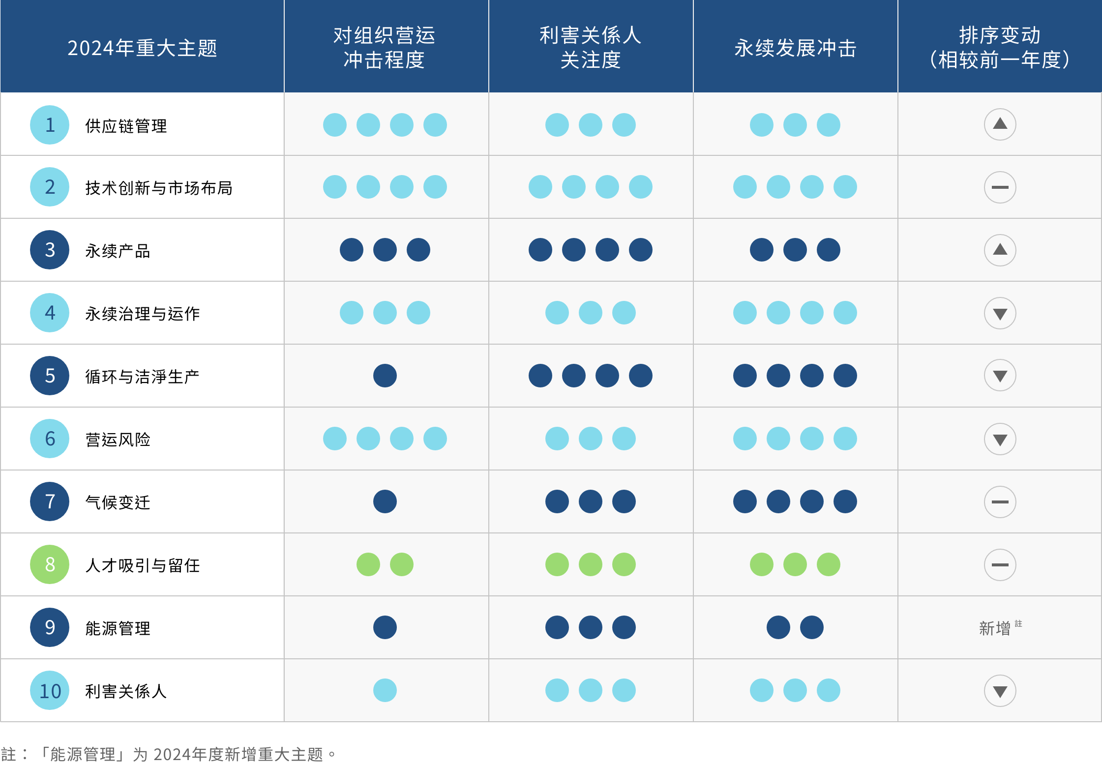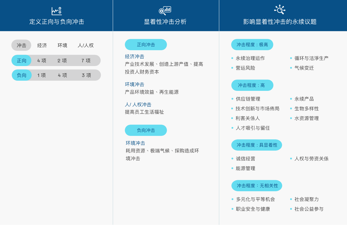 对运营的重要性 | 运营冲击 (公司价值) | 永续发展冲击 (外部冲击) | 对应章节 | |||||||||||