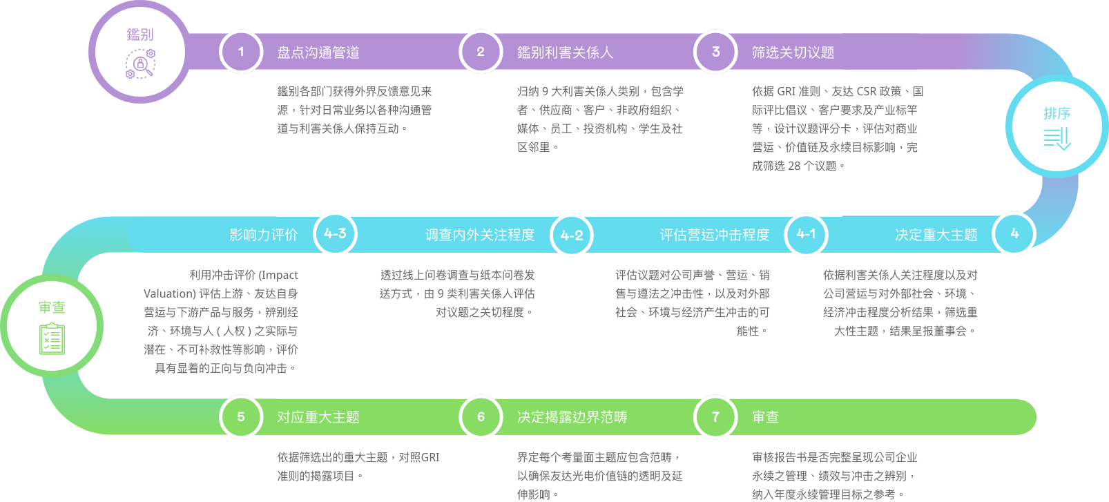 依循全球永续趋势与GRI 准则检视议题之合适性,透过问卷了解利害关系人对公司在环境、社会( 含人权)、公司治理三方面的关注面向,同时建立双重重大性评估方法,透过FUN88乐天主管与价值链的关键伙伴评估ESG 议题对公司所产生的营运冲击程度,并在ESG 外部永续发展冲击方面,根据GRI 通用准则2021(GRI Universal Standards 2021) 的GRI 3:重大主题(Material Topics 2021),整合价值平衡联盟(Value Balancing Alliance, VBA)、哈佛商学院「影响力加权会计(Impact-Weighted Accounts)」研究计画等机构发展之经济、环境及社会层面冲击评估方法学,建构以冲击为基础的重大性分析流程,辨识重大性主题。