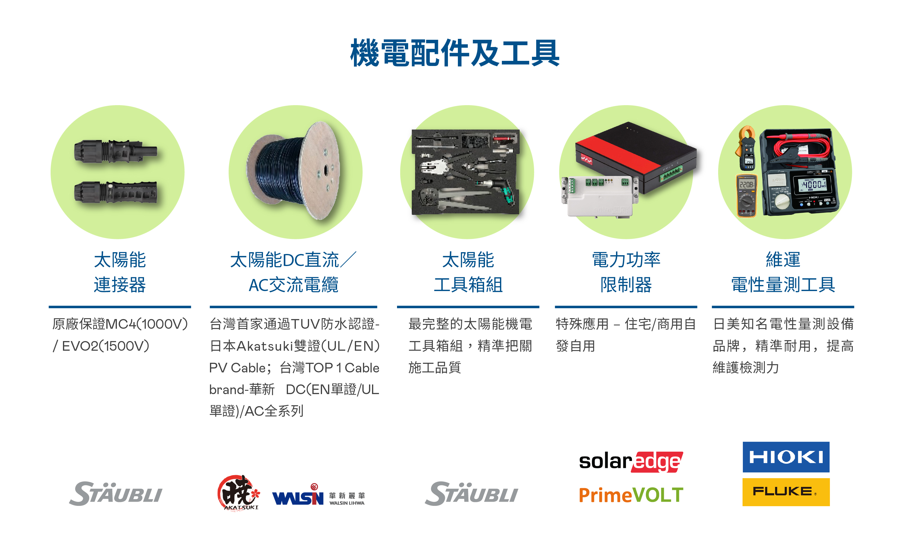 在「一站式購足」服務範疇下,FUN88樂天除自有太陽能模組及監控監控軟硬體整合方案外, 同時提供客戶太陽能電廠其它的可靠優質零組件品牌與產品,包含電廠的重要組件如變流器、連接器、電線電纜、環境偵測裝置及相關輔佐材料與工具。