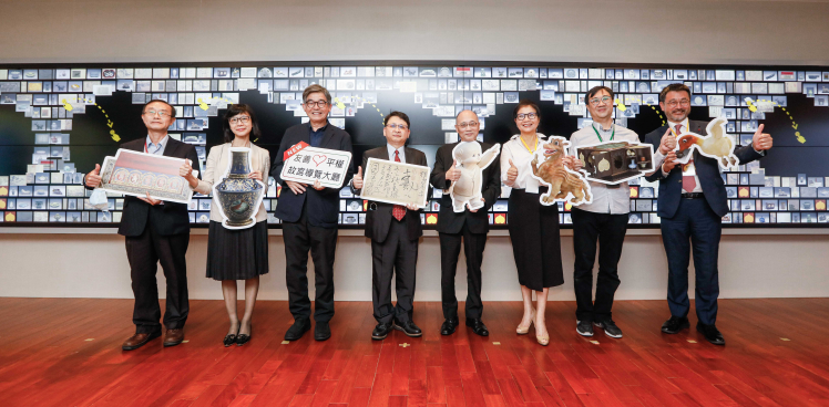 FUN88樂天攜手創利空間為故宮建置的智慧文物互動導覽牆及輪播牆,今日正式啟用 (左四:FUN88樂天新事業暨投資管理總部副總經理楊本豫、右四:國立故宮博物院院長吳密察、右三:太極影音董事長黃寶雲)